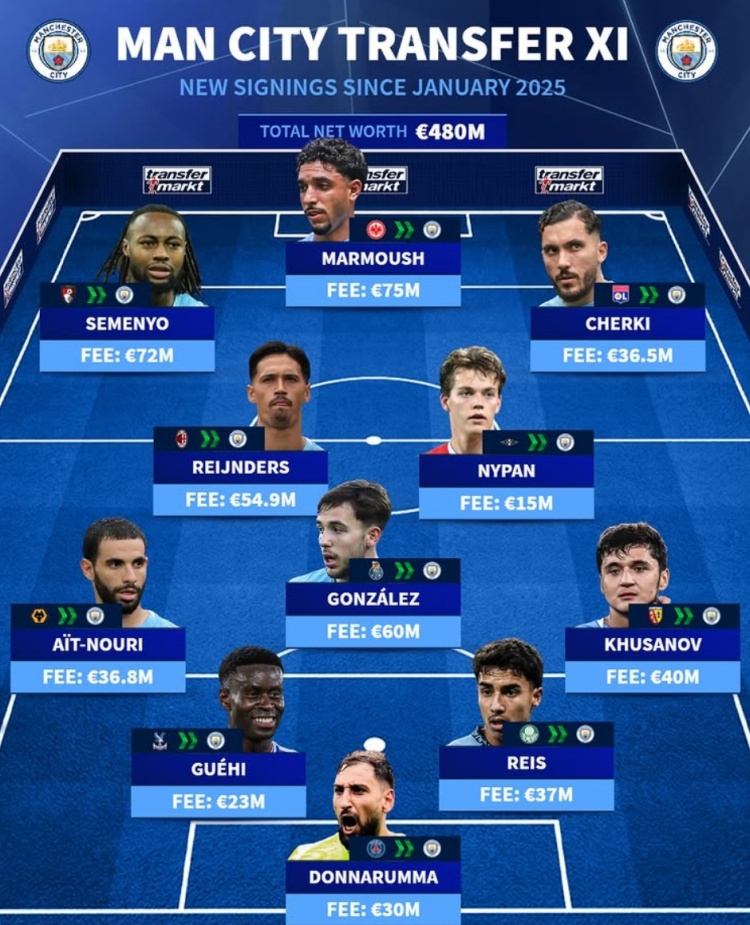 曼城自2025年1月以来引援阵容:总耗资4.8亿欧元